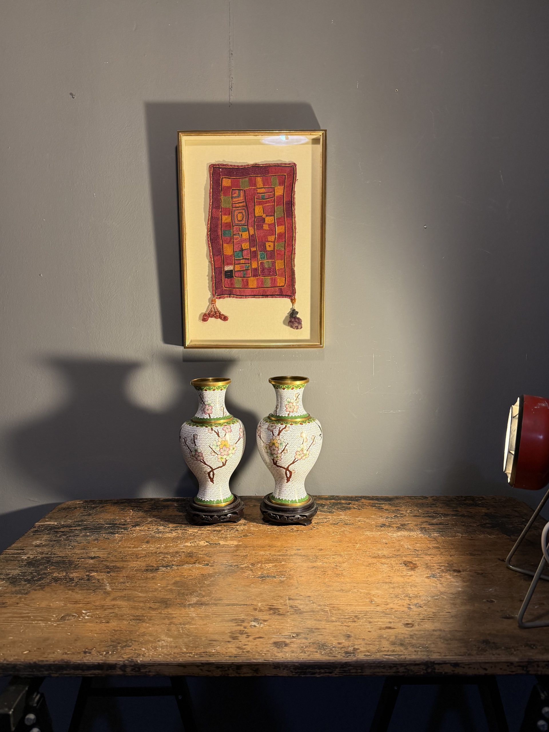 Pereche de vaze decorative realizate în tehnica cloisonné, din alama emailat și aurit.