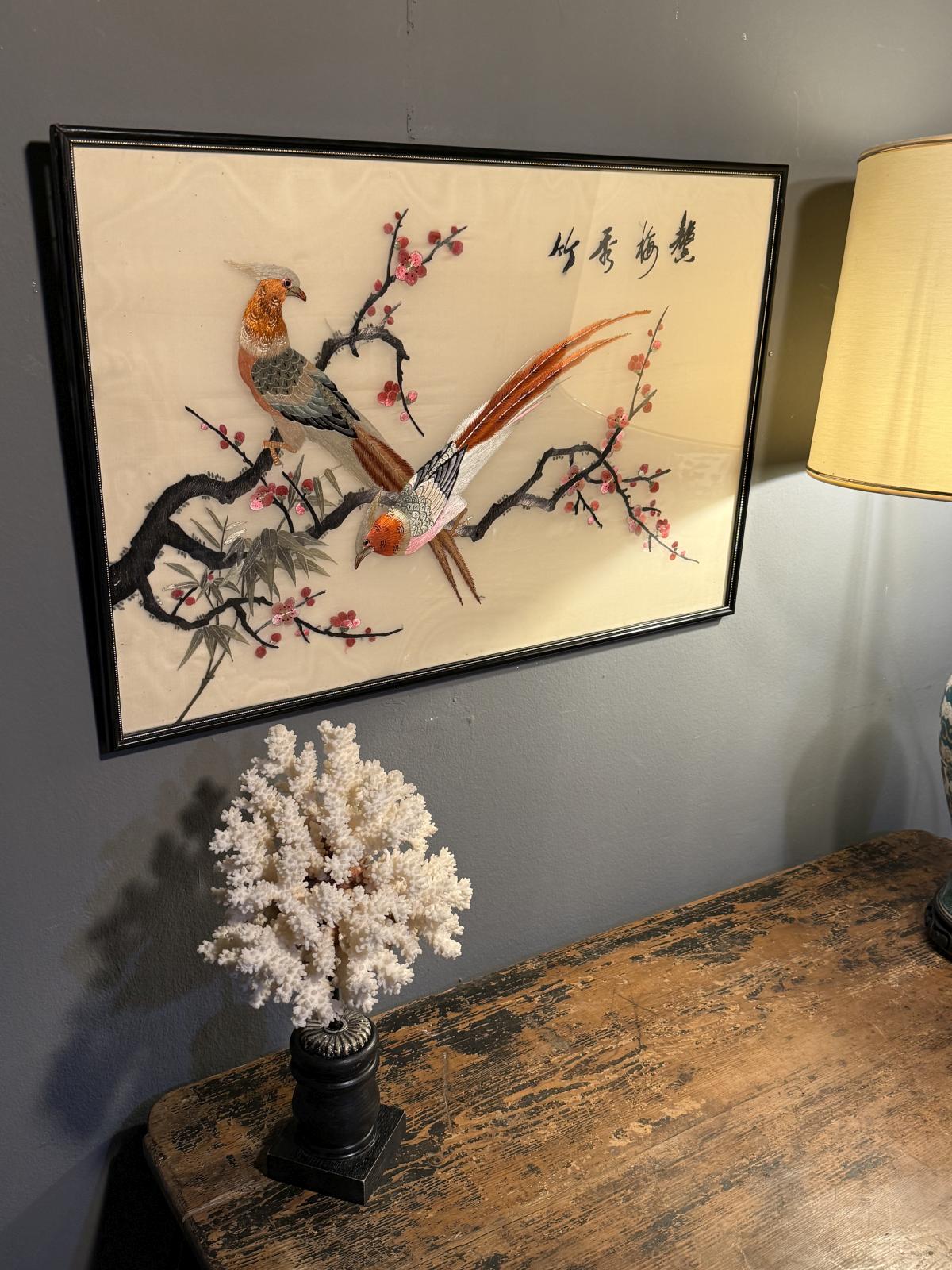 Tablou decorativ asiatic brodat în relief, cu păsări și flori de prun