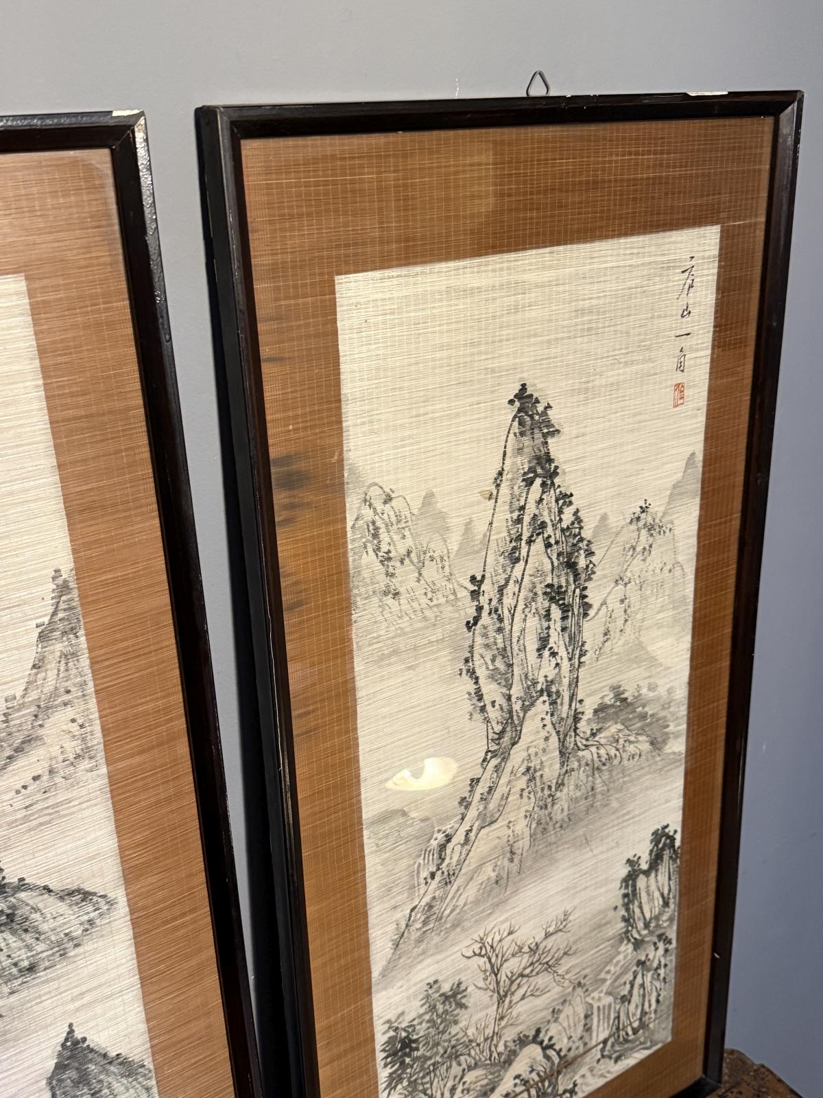 Pereche de tablouri chinezești reprezentând peisaje montane tradiționale, realizate în tuș pe mătase.