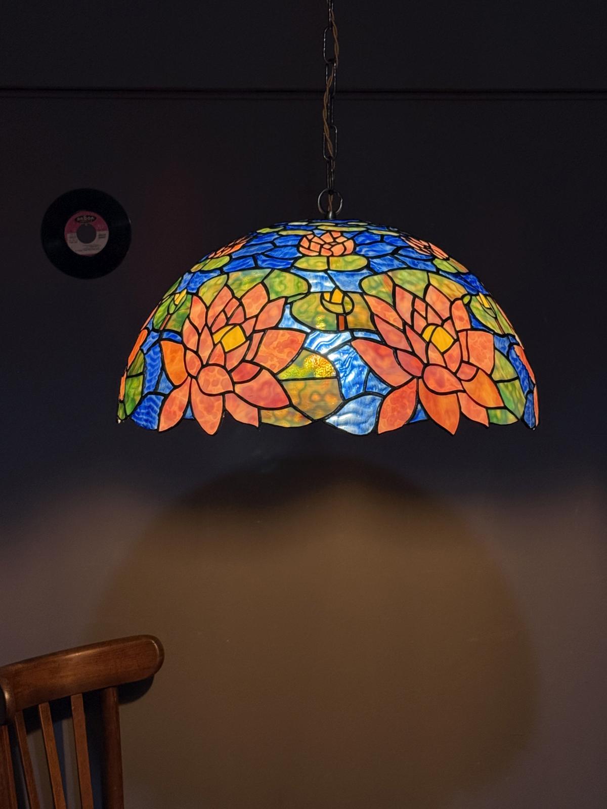 Abajur de mari dimensiuni, realizat integral din sticlă montată în stil vitralii.