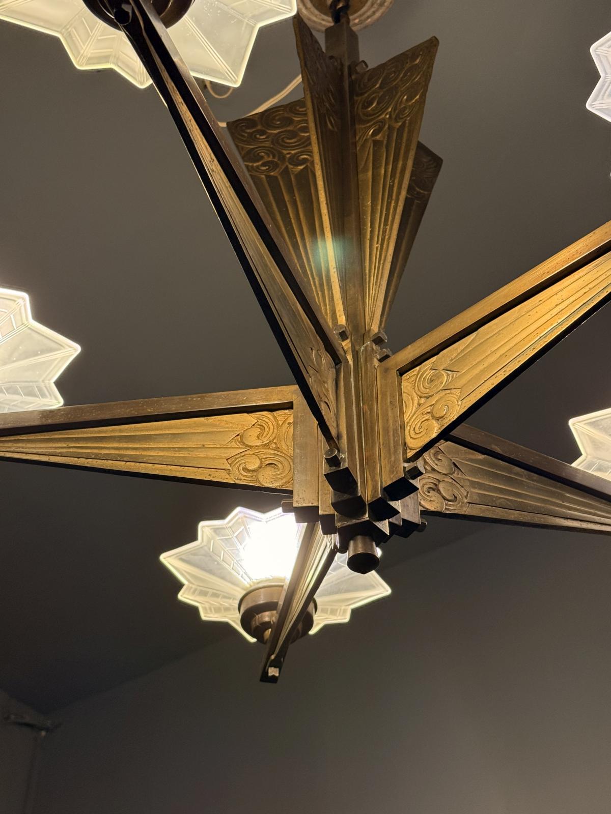 Impresionant lustru vintage realizat integral din alamă grea, cu brațe decorate în stil geometric specific Art Deco și abajururi din sticlă mată, în formă de stea cu nervuri decorative.