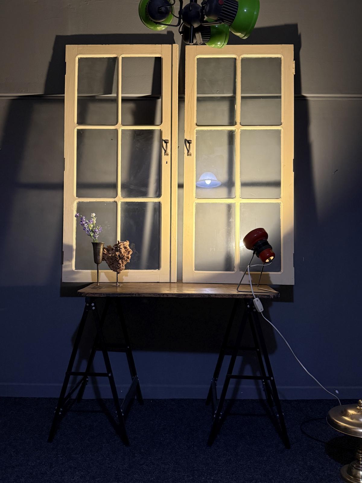 Set format din două uși vechi din lemn, cu împărțire în mai multe geamuri, inspirând aspectul unor ferestre tradiționale.